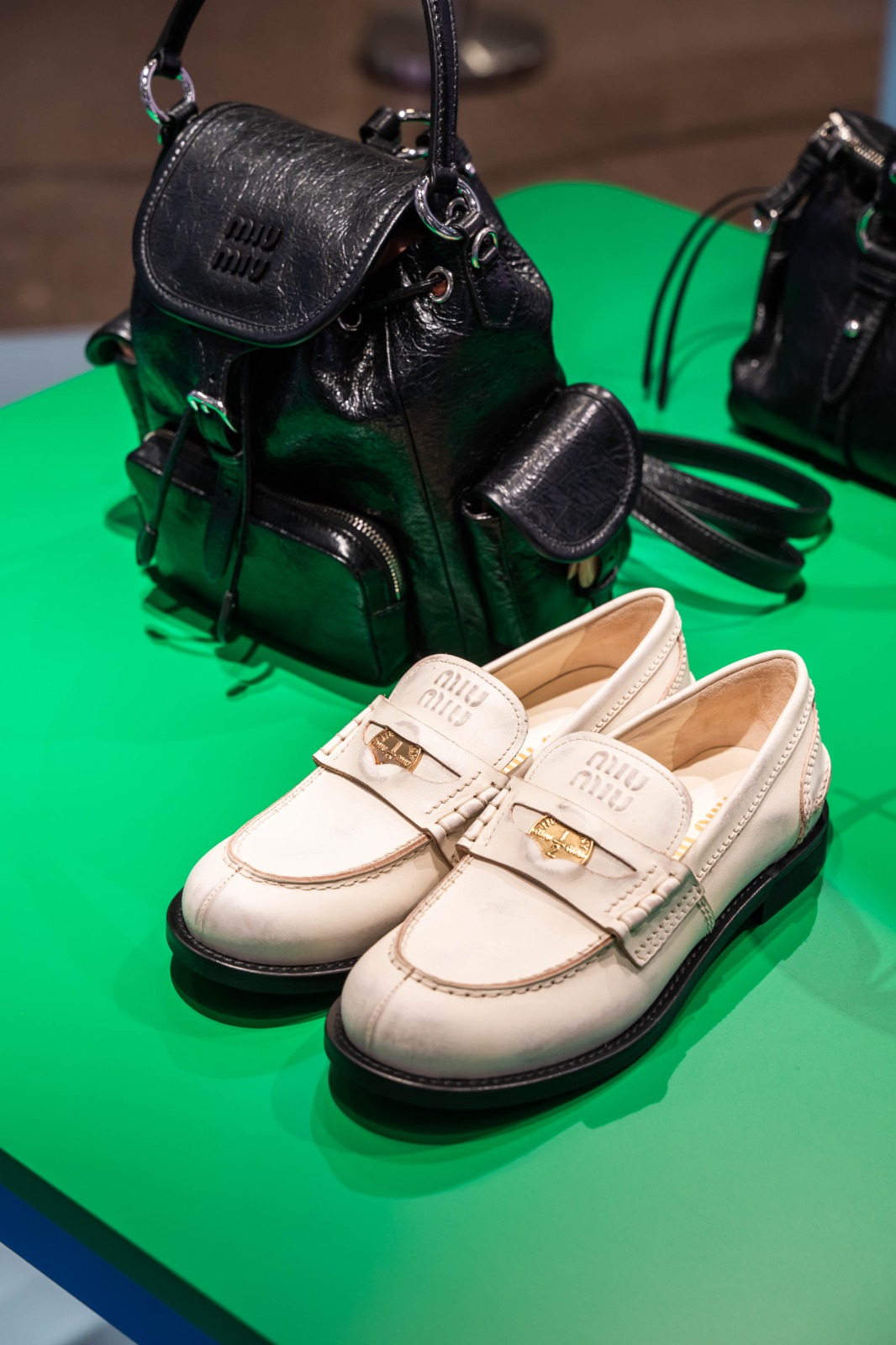 For handbags, Miu Miu’s identity is strongly expressed with the inclusion of aged leathers – vitello antic, crackle, and old nappa – and both neutral and vibrant colors, alongside styles in vitello shine and soft calf. In footwear, the penny loafer – in calf leather – is presented in a new butter shade. Directly from the Spring/Summer 2006 runway, the sabot shoes and boots bring a robust, contemporary attitude, evoking the strength and functionality that Miu Miu represents. Finally, the sneaker offering centers around the iconic Plume styles, both classic and ballerina, presented in nylon and suede, in exclusive colors and fabrications and with a new buckle detail, all with a distinctive blend of sportiness and femininity.