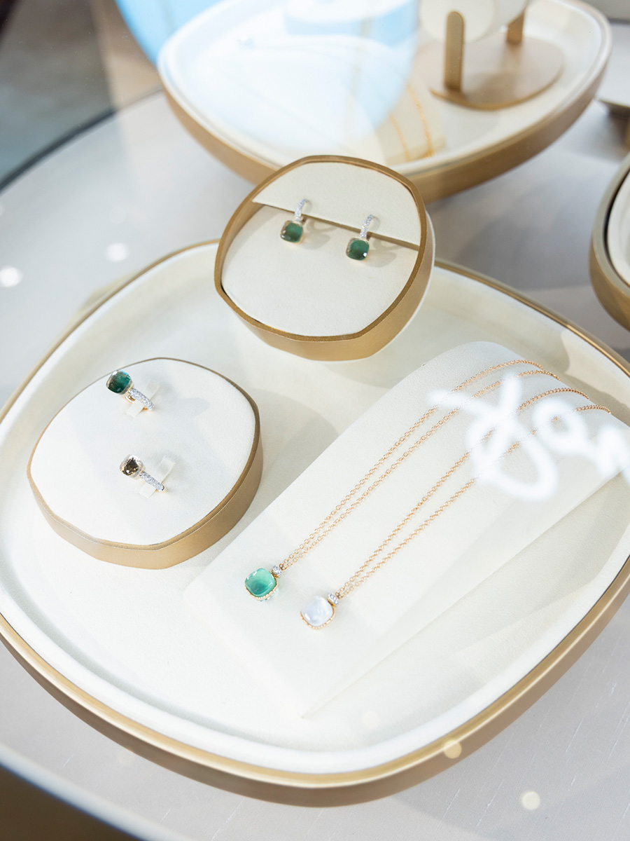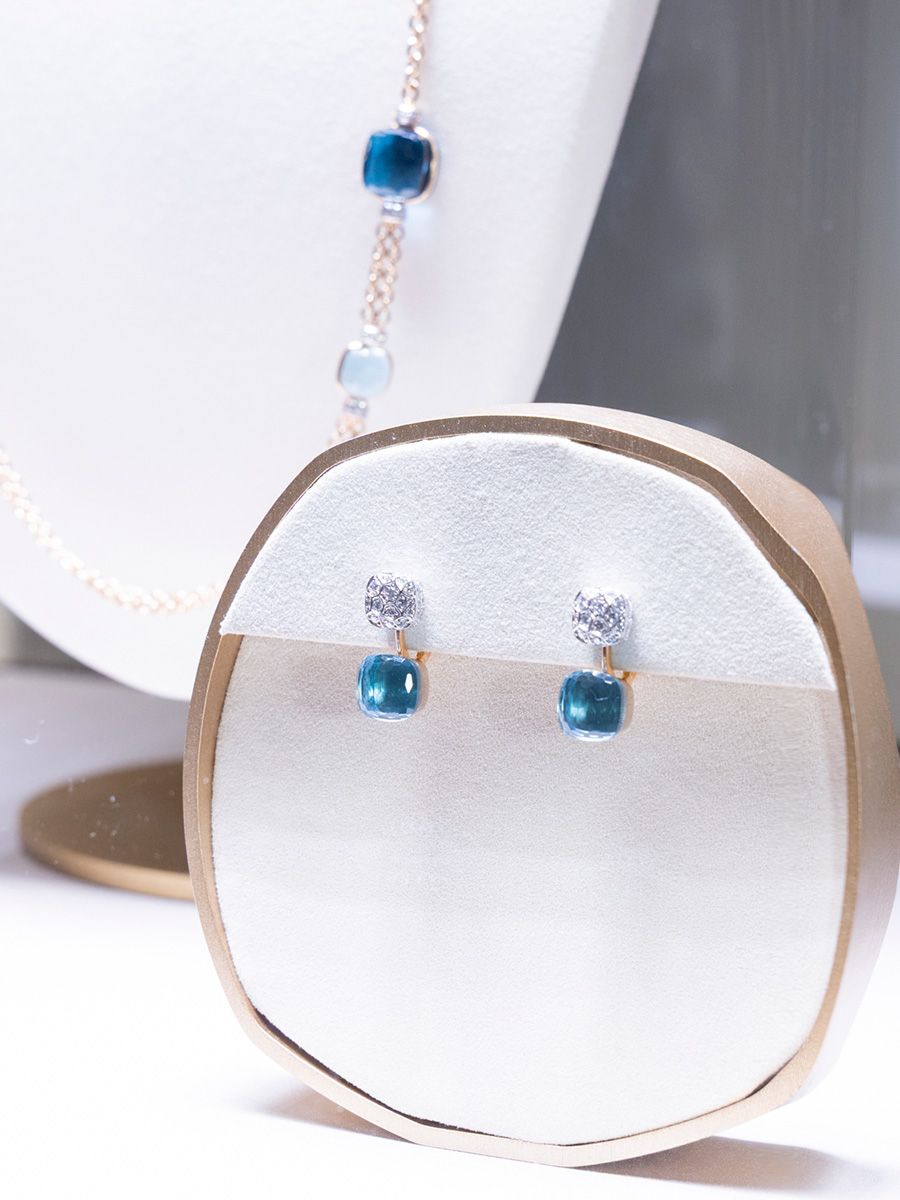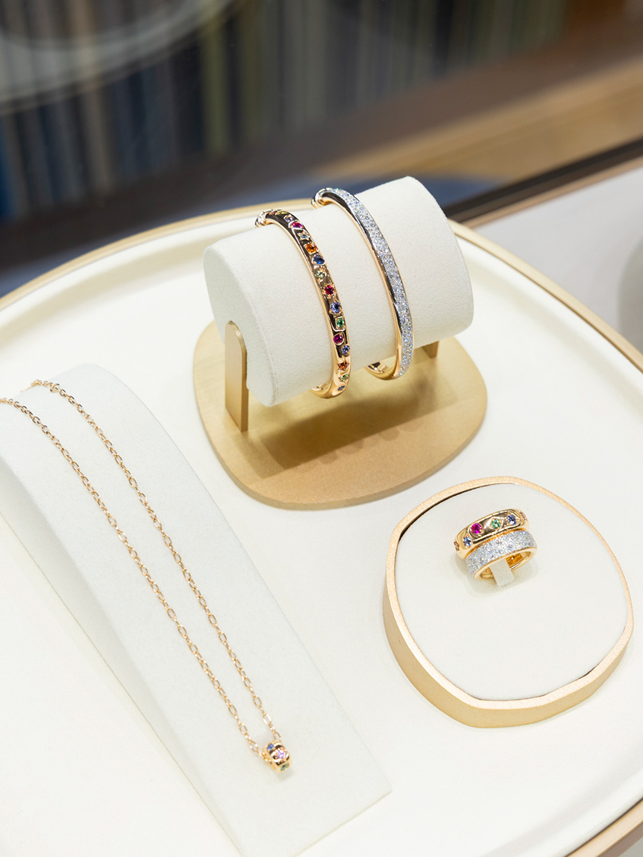 At the heart of the pop‑up lies the newest creations of the Nudo collection: jewels that explore color in concert, with gemstones moving together in balance to reflect every facet of a woman’s life. For this milestone year, Pomellato unveils new Nudo Rivière necklaces in rose and white gold, featuring vibrantly bright clessidra‑cut gemstones gathered at the center in softly asymmetric compositions. London blue and sky‑blue topazes, purple amethyst, crisp green peridot, and the Maison’s new prasiolite and green agate doublets come together in expressive harmonies, offering creations designed to be worn, stacked, and lived in, each reflecting the emotional depth and joyful identity that Nudo has embodied since its conception in 2001.