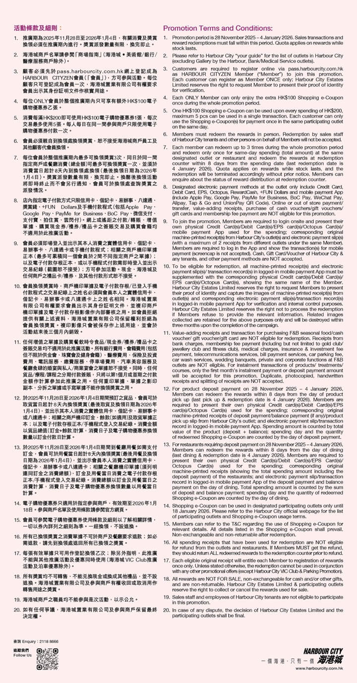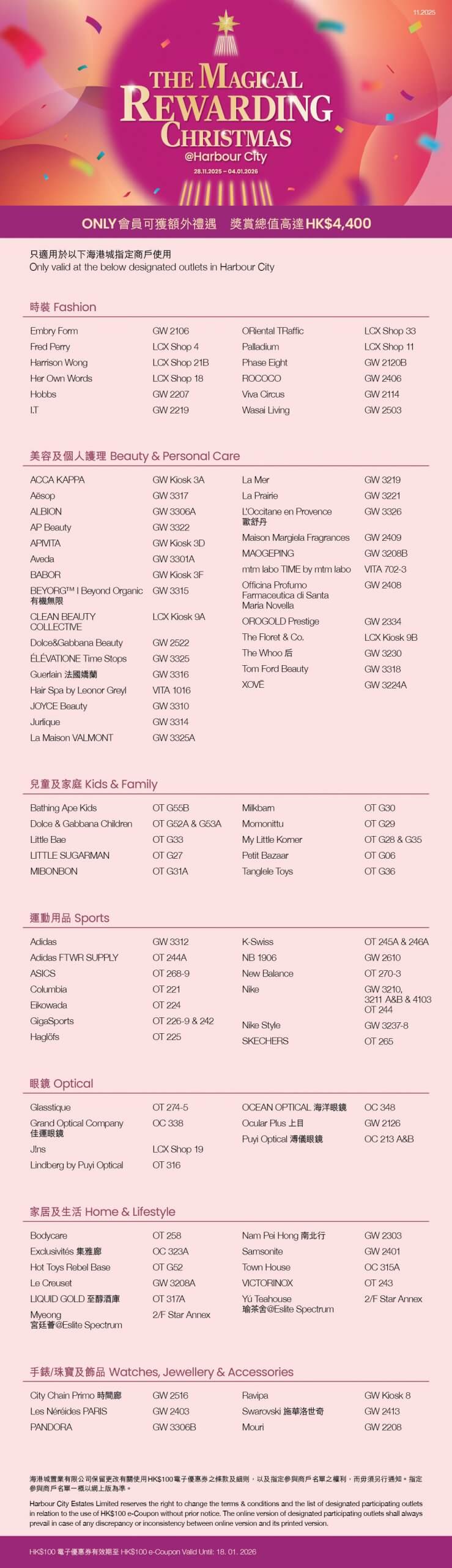 List of Designated Outlets of HK$100 e-Shopping Coupon – The Magical Rewarding Christmas @Harbour City