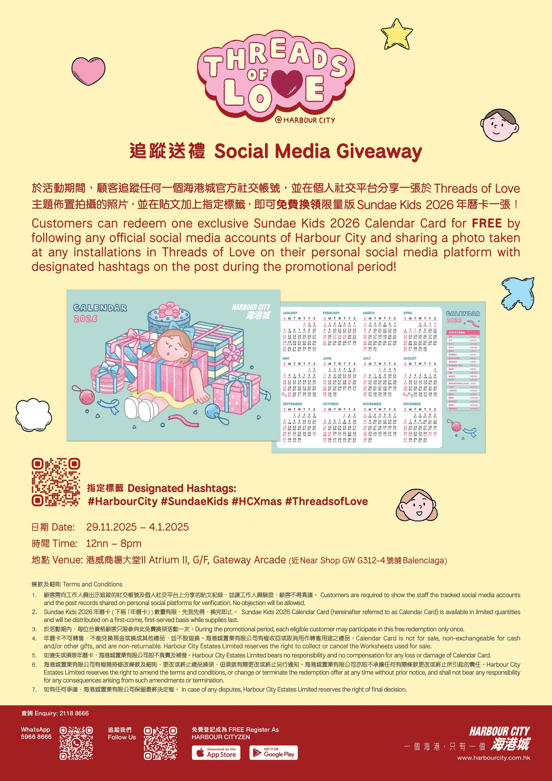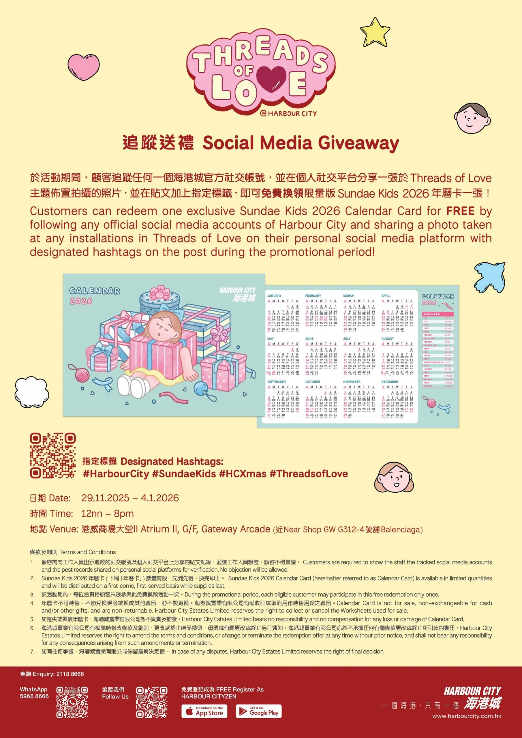 Harbour City and Sundae Kids have prepared a delightful holiday gift for everyone – a limited-edition Sundae Kids 2026 Calendar Card. This special calendar card features a selection of classic Sundae Kids illustrations, allowing the artists’ warm touch to accompany you throughout 2026.