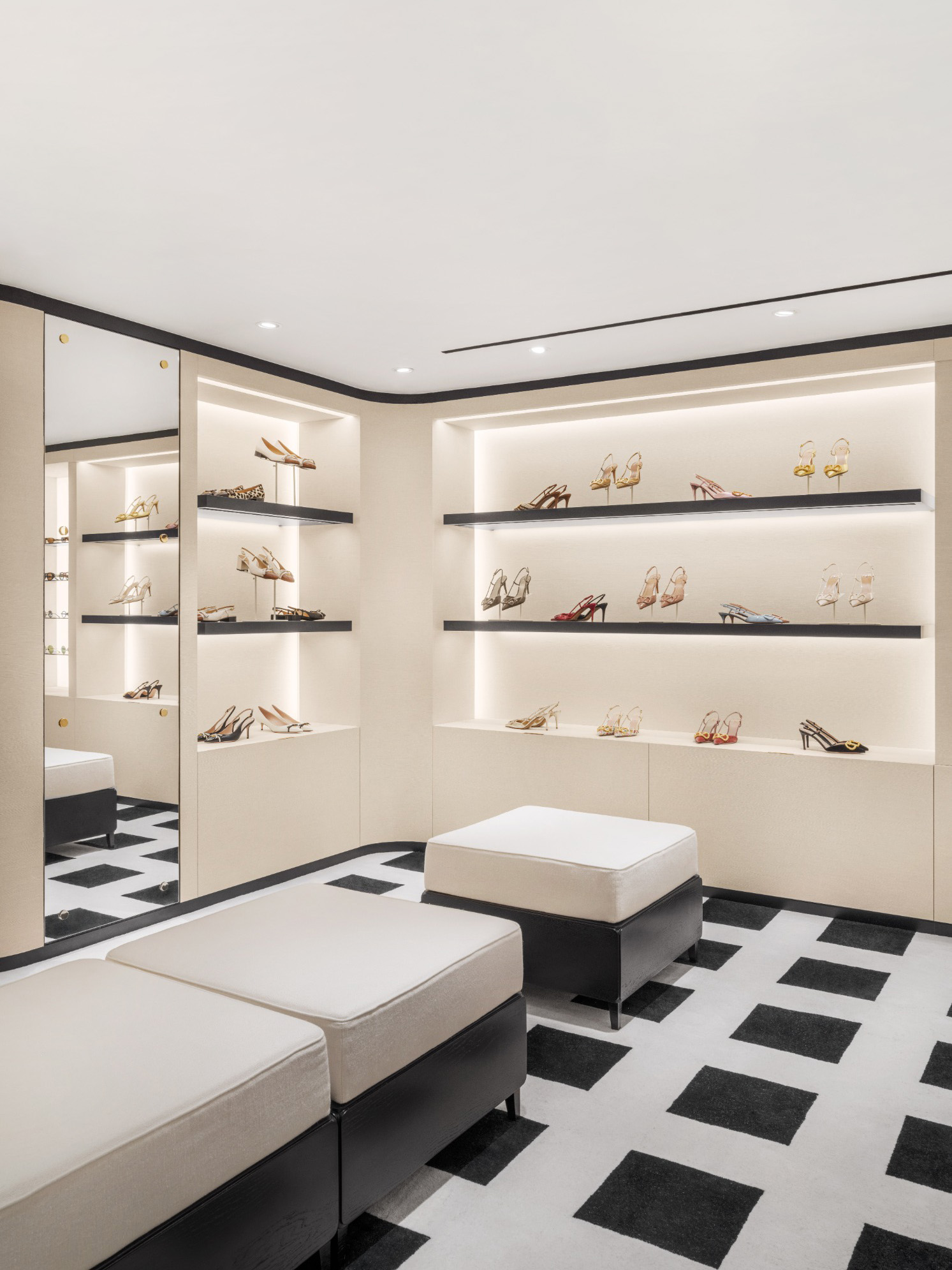 同时,家具设计亦细緻入微,展柜以镜面材质打造,而浑然天成的手工门把则突显品牌对细节的专注与工艺美感。