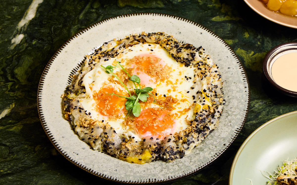 嚴選新鮮雞蛋,以精準控溫烹調至蛋白細滑柔嫩、蛋黃保持流心質感。蛋液中加入每日炒香的黑芝麻,保留細微芝麻顆粒,香氣濃郁。內層加入車打芝士與馬蘇里拉芝士,切開時流心蛋黃與半融芝士交織,芝麻香與芝士鹹香層層融合。