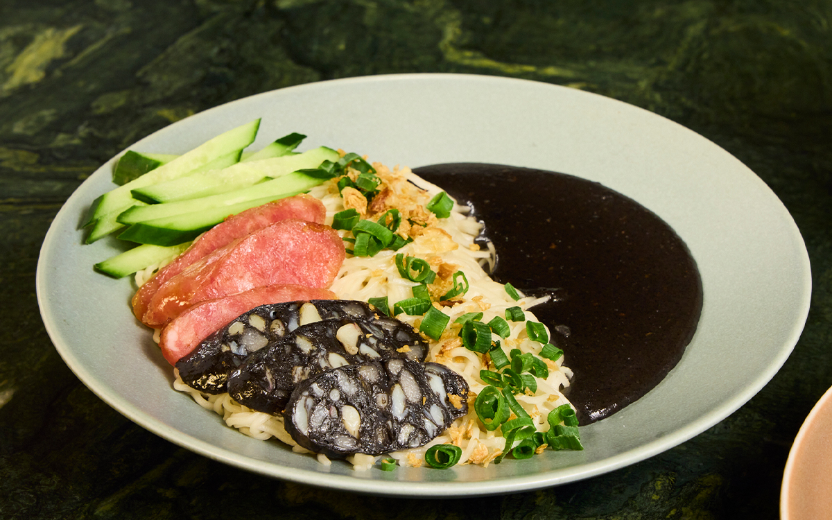 选用弹韧爽滑的担担面作为基底,面条口感富嚼劲,能充分吸附酱汁。拌入以特调的秘制芝麻酱,当中加入自家研磨黑芝麻及胡麻酱,香气浓郁而层次分明。配料方面包括台湾原味香肠与墨鱼香肠,前者咸甜肉香浓厚,后者带有淡淡海洋鲜味;另配以清爽青瓜丝与花生碎增添口感,再撒上金黄香脆的红葱头提升整体香气。当面条与芝麻酱充分拌匀后,芝香与香肠油脂交织,配合青瓜的清爽与花生的香脆,呈现丰富而平衡的台式拌面风味。
