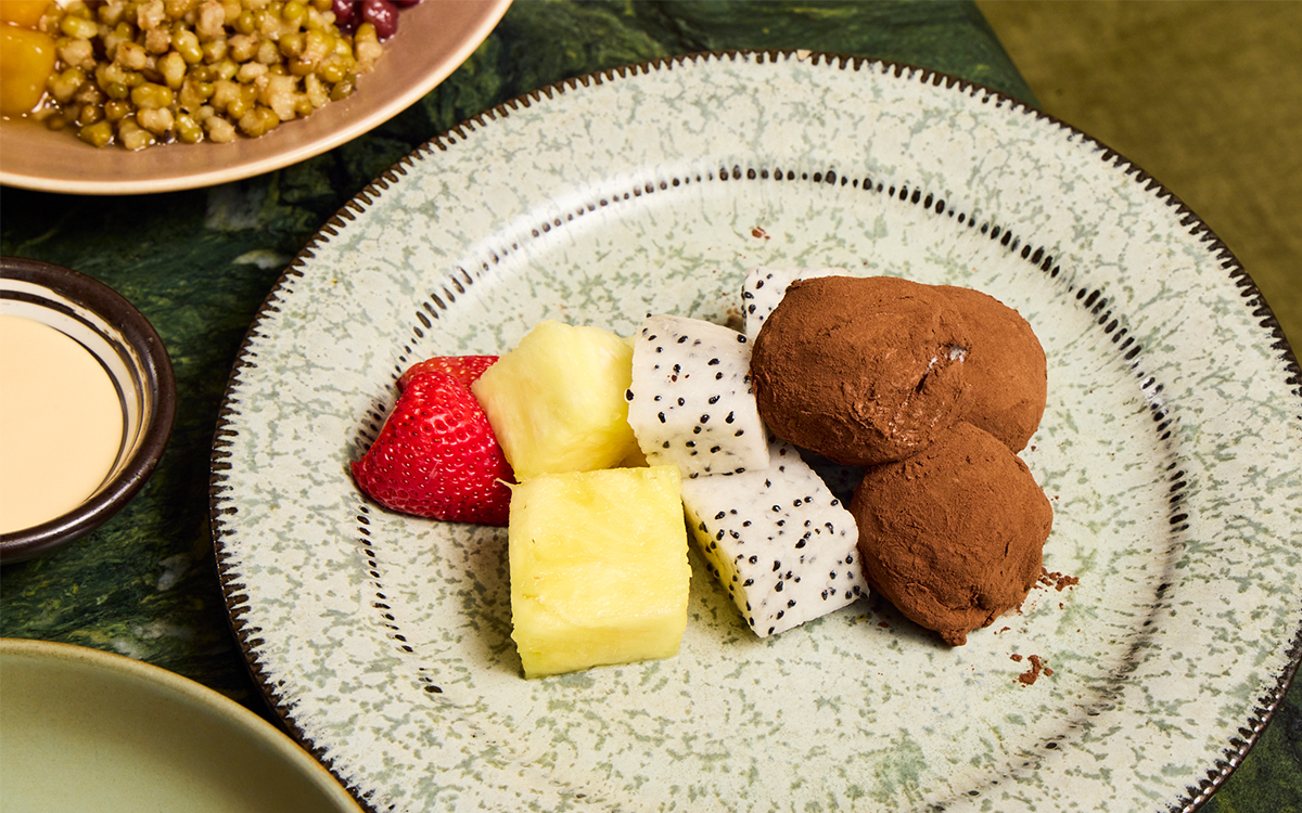 灵感来自传统麻糬结合现代「脏脏」甜品风格。外层以糯米制作软糯麻糬皮,包裹自家制作的黑芝麻馅,黑芝麻每日炒香后研磨,再加入椰丝拌煮成细滑馅料,口感扎实绵密而不设流心。成品外层裹上可可粉与坚果碎,芝麻、可可与坚果香气交织,并配上时令新鲜水果,为浓郁风味增添一抹清甜平衡。