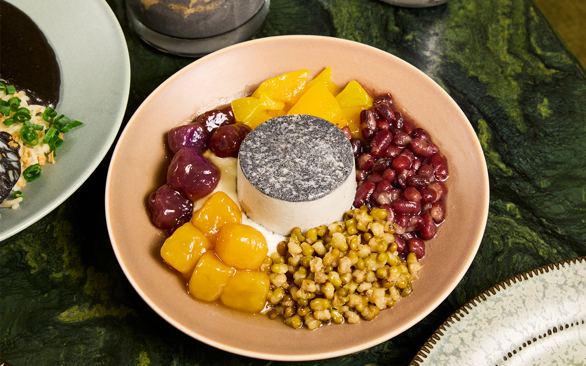 以黑芝麻酱、鲜牛奶与细砂糖调制布丁基底,充分混合后倒入模具冷藏定型,质地幼滑细腻,入口绵密顺滑,散发淡雅芝麻香气。布丁旁配以烟韧麻糬、弹牙芋圆、绵密红豆及新鲜芒果粒等食材,口感由柔滑、软糯到弹牙层层交错,并带来芝麻香味与果香的清新对比。甜品另附椰汁同享,椰香清甜、质地顺滑,为芝麻的浓郁风味增添清新平衡。
