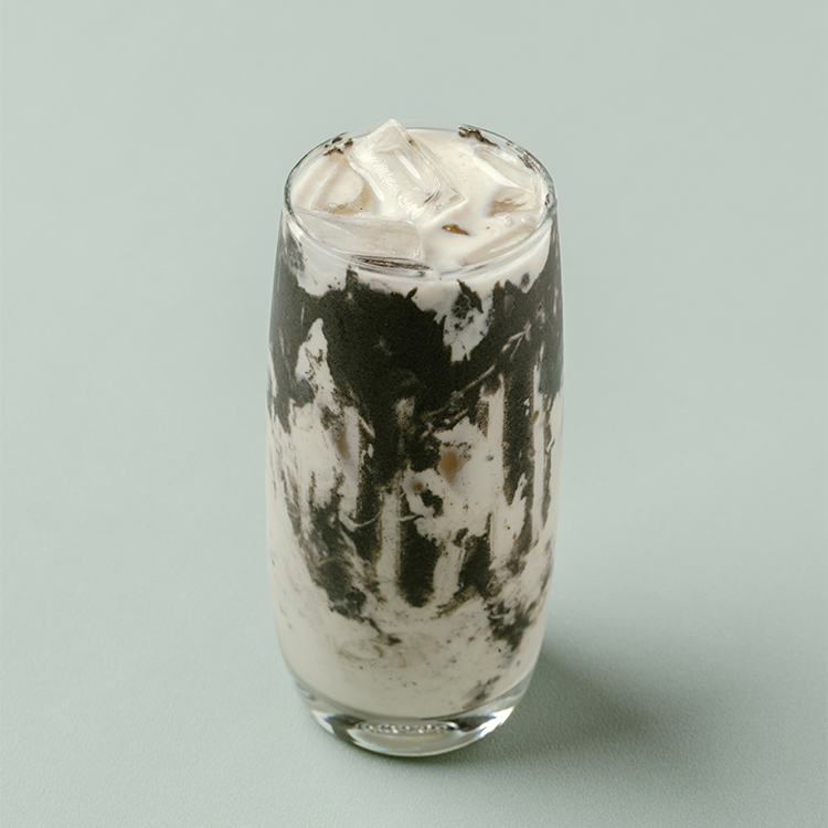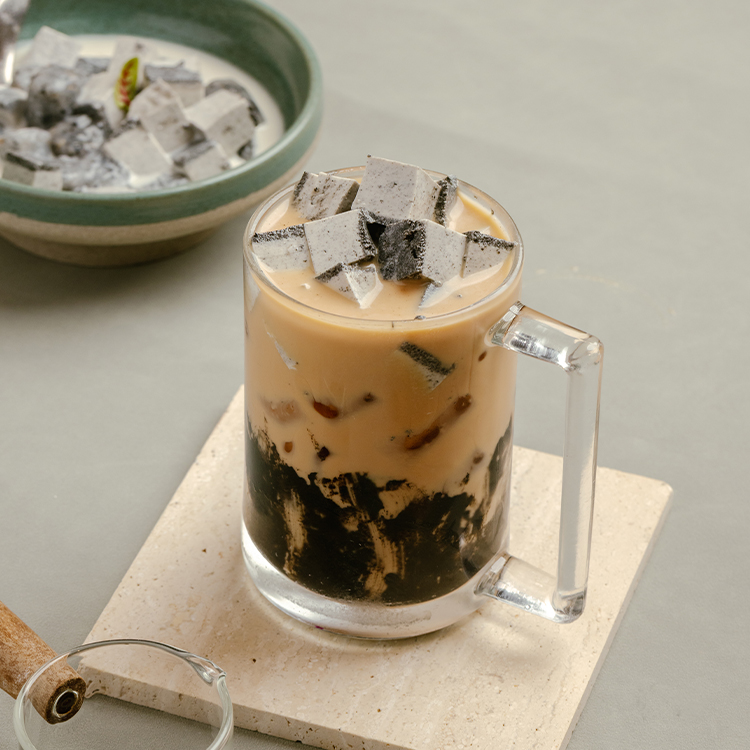 在饮品设计上,系列将黑芝麻的浓郁香气延伸至杯中体验。制作时,厨师先将黑芝麻酱细致抹于杯壁,让浓稠芝麻酱沿杯身形成自然纹理,不仅提升视觉层次,亦让芝麻香气在倒入饮品时与液体慢慢融合,风味更为立体。系列带来「黑芝麻厚椰奶」及「黑芝麻布丁奶茶」两款特色饮品:前者以浓郁椰奶为基底,加入炒香黑芝麻调制,椰奶的柔滑奶香与芝麻味道交织,口感醇厚顺滑;后者则以香浓奶茶为基底,加入以黑芝麻酱制作的芝麻布丁粒,布丁质地细滑柔软,与奶茶的醇厚茶香互相映衬,芝麻香气与奶茶香气层层交织,带来丰富而细腻的饮用体验。