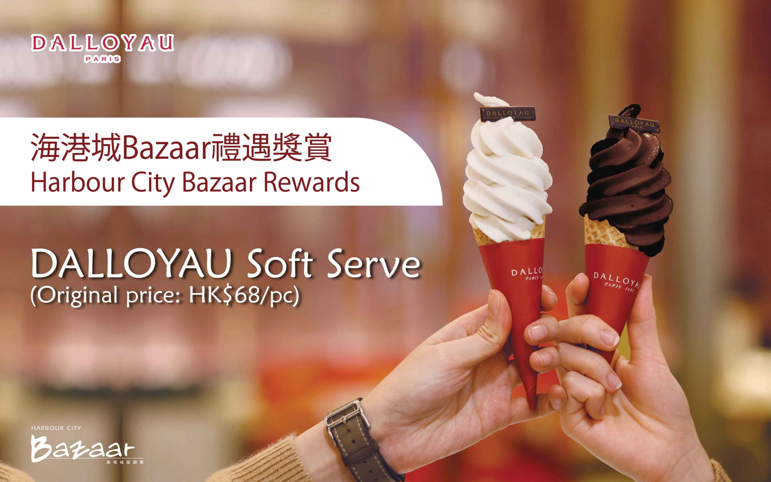 顾客于指定活动日子* 内在Harbour City Bazaar 每期活动单一消费满HK$100即可到指定海港城港威商场二阶询问处(近港威商场2421-2号铺 KENZO)出示盖有海港城展销集 Harbour City Bazaar印章之商户单据正本,以获得礼遇盖印一个,六期活动内收集任何两款不同盖印即可到DALLOYAU 换领软雪糕一支(Price: HK$68) 。