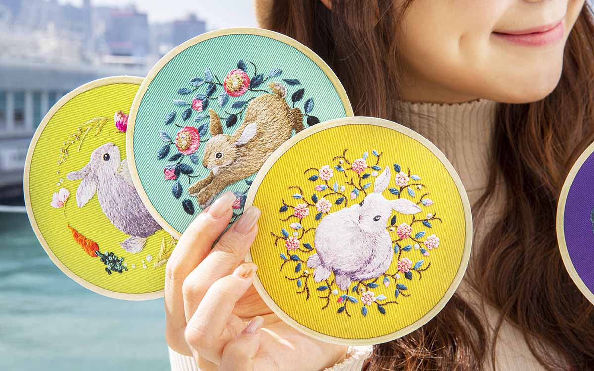 要細緻描繪兔子的雪白外型及動態一點都不容易,海港城今年新春特別邀請日本刺繡藝術家森本繭香,親手創作了6幅喜兔花繡圖,一針一線呈現兔子在花海中悠然自得的想像。時而活潑跳脫、時而乖巧恬靜的玉兔更一躍到利是封上,化身成鮮艷奪目的海港城「喜兔迎春」刺繡利是封。