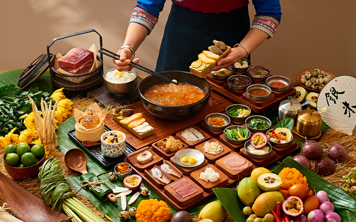 繼而奉上休漁期後最新鮮的「福建黃魚配貴州酸湯醬汁」奇妙搭配,採用福建特產的黃花魚,經過3-5天的熟成,大幅降低了魚腥味,使肉質更加細軟,表皮更加酥脆。將其浸泡於貴州特色酸湯中,配上野生薯仔菜等當季蔬菜,打造出一道口感獨特的菜品。配以潮汕芹菜仔及番茄salsa醬,為您呈現出一場別具特色的味覺盛宴;及有當季野生牛肝菌熬製的「醉雞湯燴飯」作為主菜,這道菜品選用了由咸香辣味的剝皮辣椒和香菇等食材浸泡而成的醉雞,配以當季野生牛肝菌,營造出一種迷人的醉人風味。燴飯入口綿軟,香氣四溢,讓整個味蕾都沉醉在這份溫暖而濃郁的鄉土風味之中。