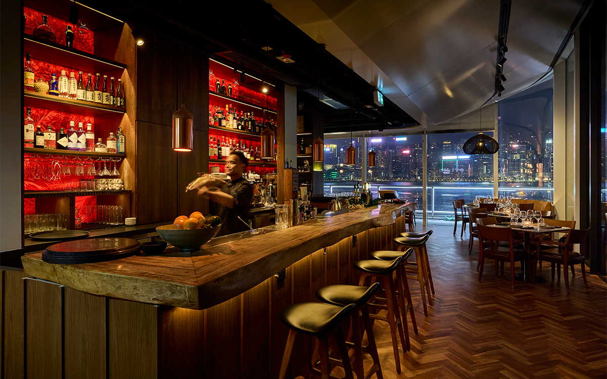 而酒吧區則以紋理木打造,配以大理石吧枱及柔光鏡面背牆為點綴,讓客人寫意舒適地與身旁的人相談甚歡,一起分享餐前精選美酒。溫暖且明亮的自然光透進餐廳,隨著時間變化看盡正午、黃昏和夜晚之不同景色;除了慶祝特別日子來一頓浪漫用餐,還是朋友聚會及商務聚餐之理點地點。