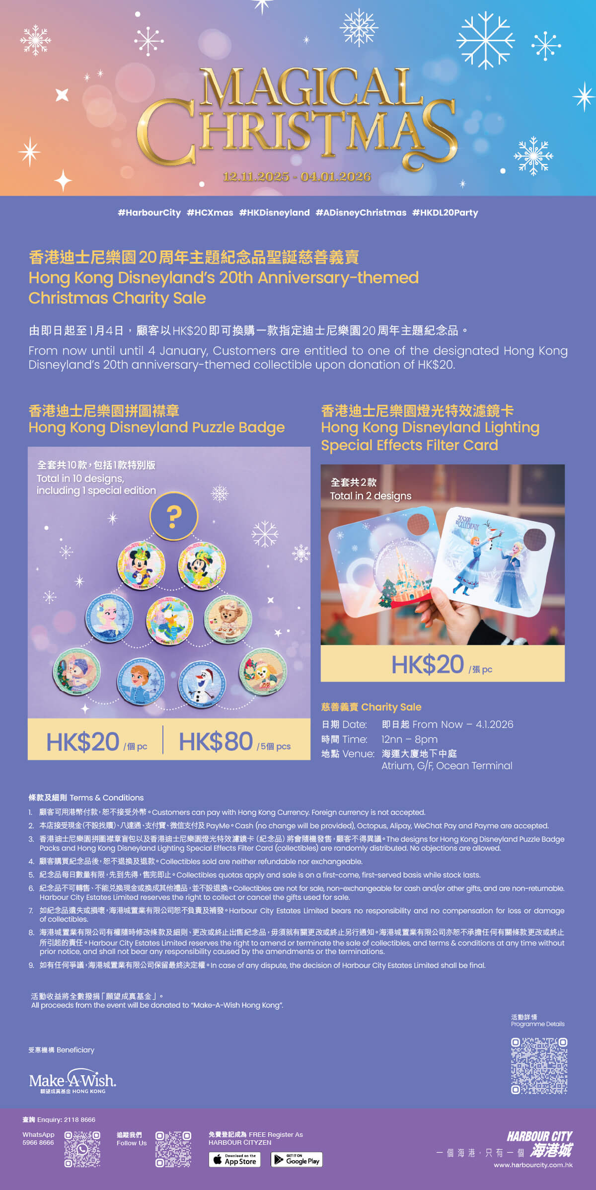 即日起至1月4日,顧客只要捐款HK$20即可換購一款迪士尼樂園20周年主題紀念品,包括香港迪士尼樂園拼圖襟章以及香港迪士尼樂園燈光特效濾鏡卡。