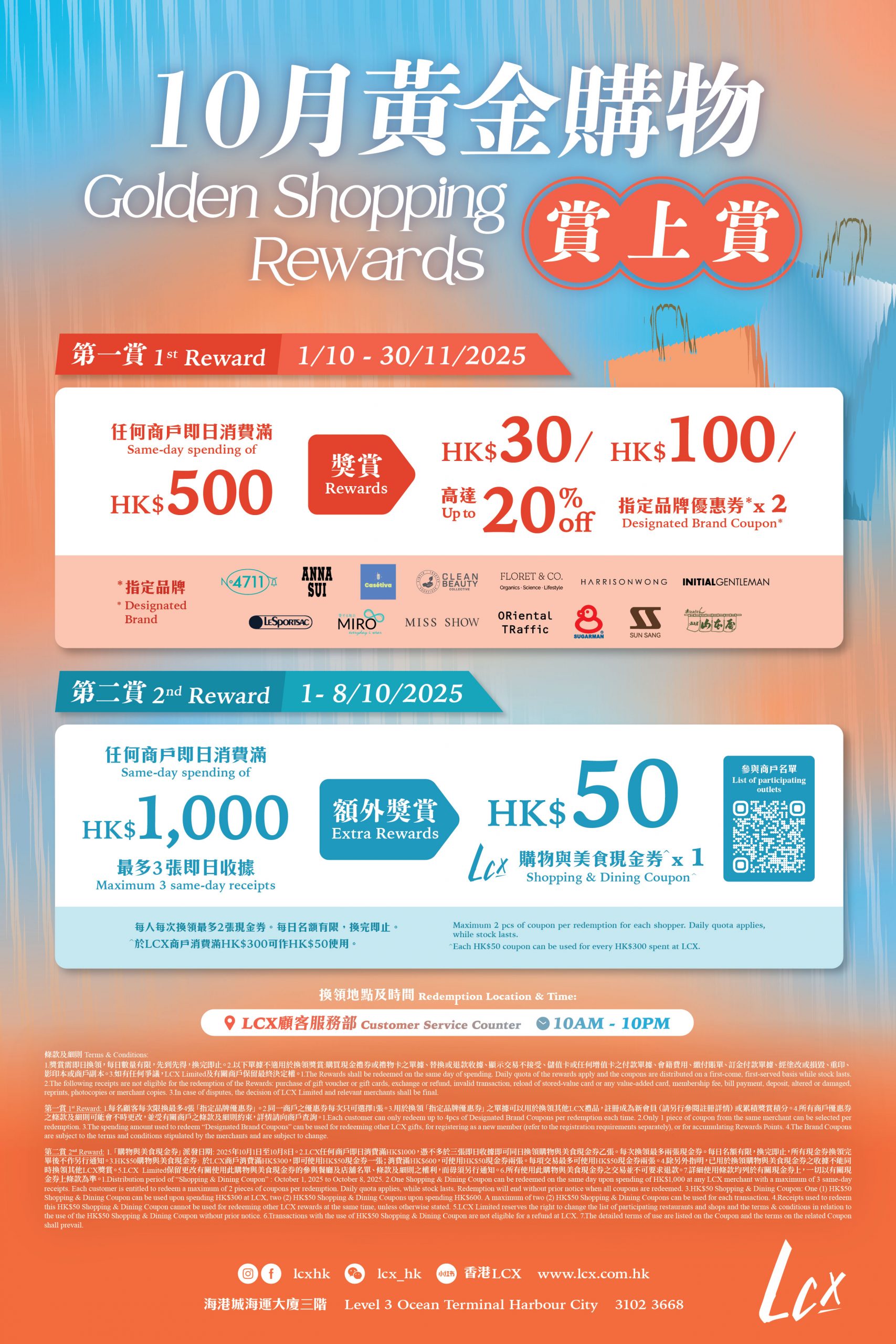 即日至11月30日,消費滿HK$500可獲兩張指定商戶優惠券;即日至10月8日,消費滿HK$1,000可額外獲HK$50現金券乙張,換完即止。受條款約束。
